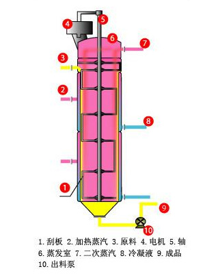 在浓缩过程液层很薄,溶液沸点升高可忽略,料液在加热区域停留时间,随浓缩器的高度(长度)和刮板的导向角、转速等因素而变化,一般在2秒~45秒左右。