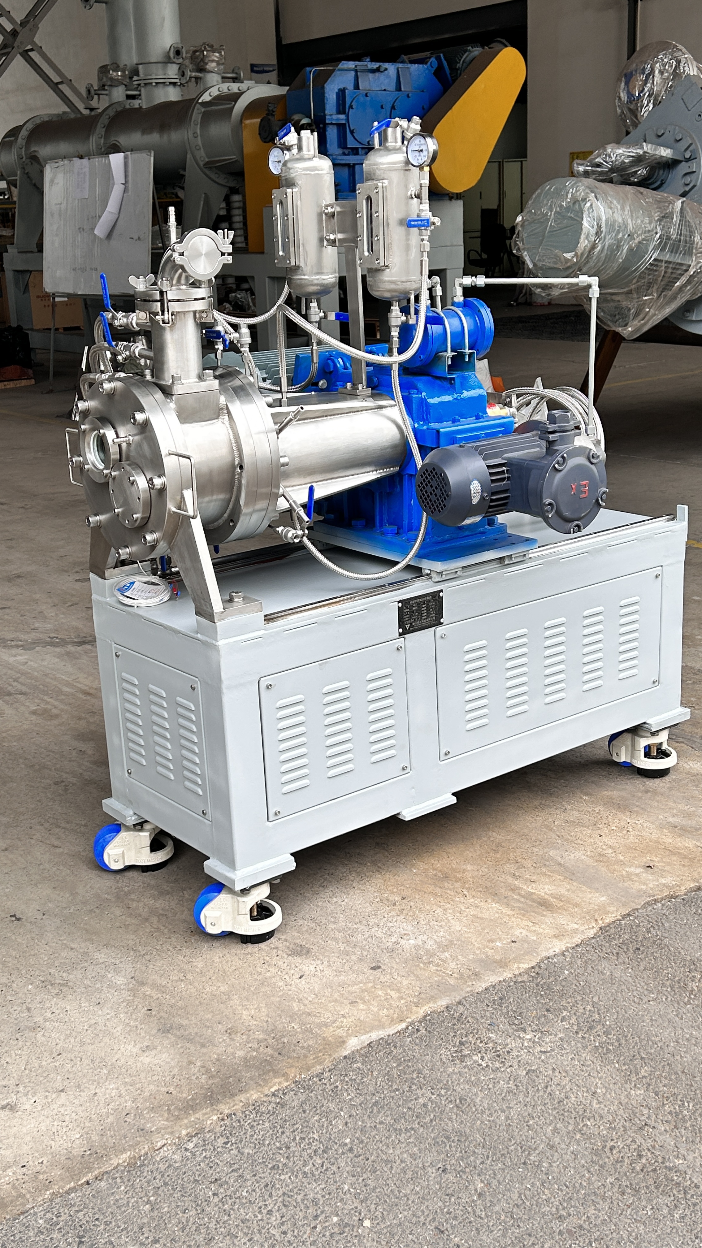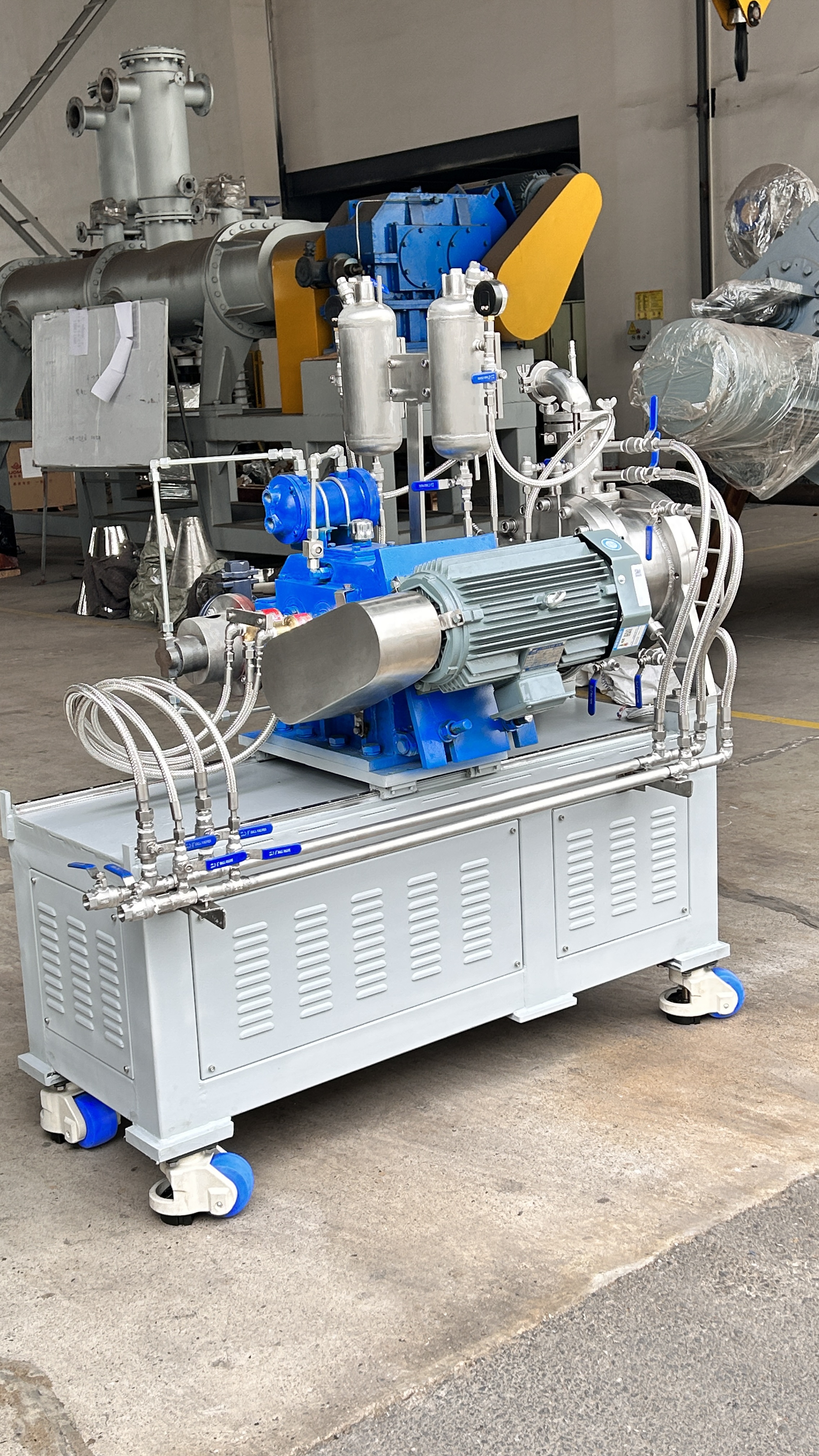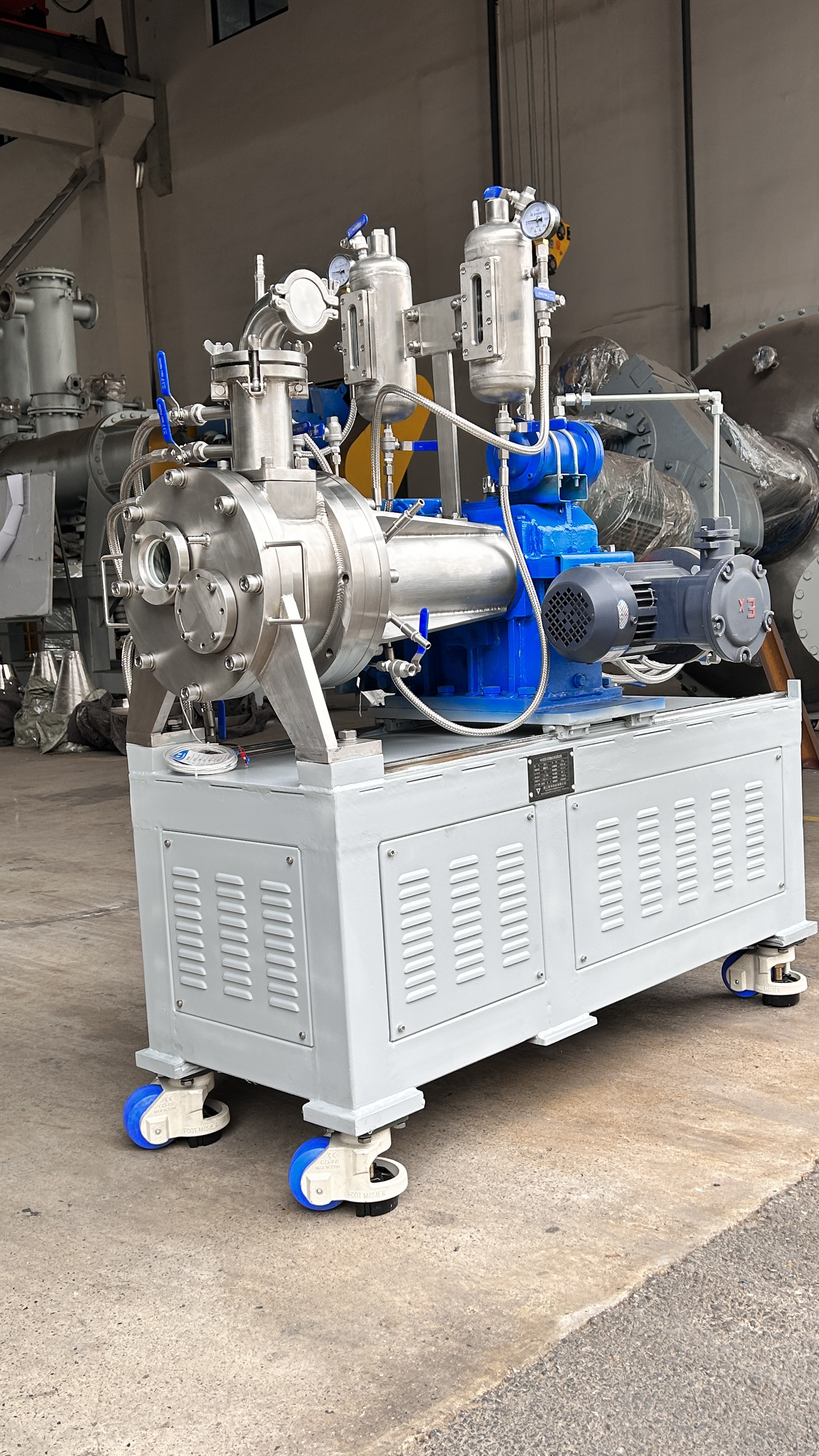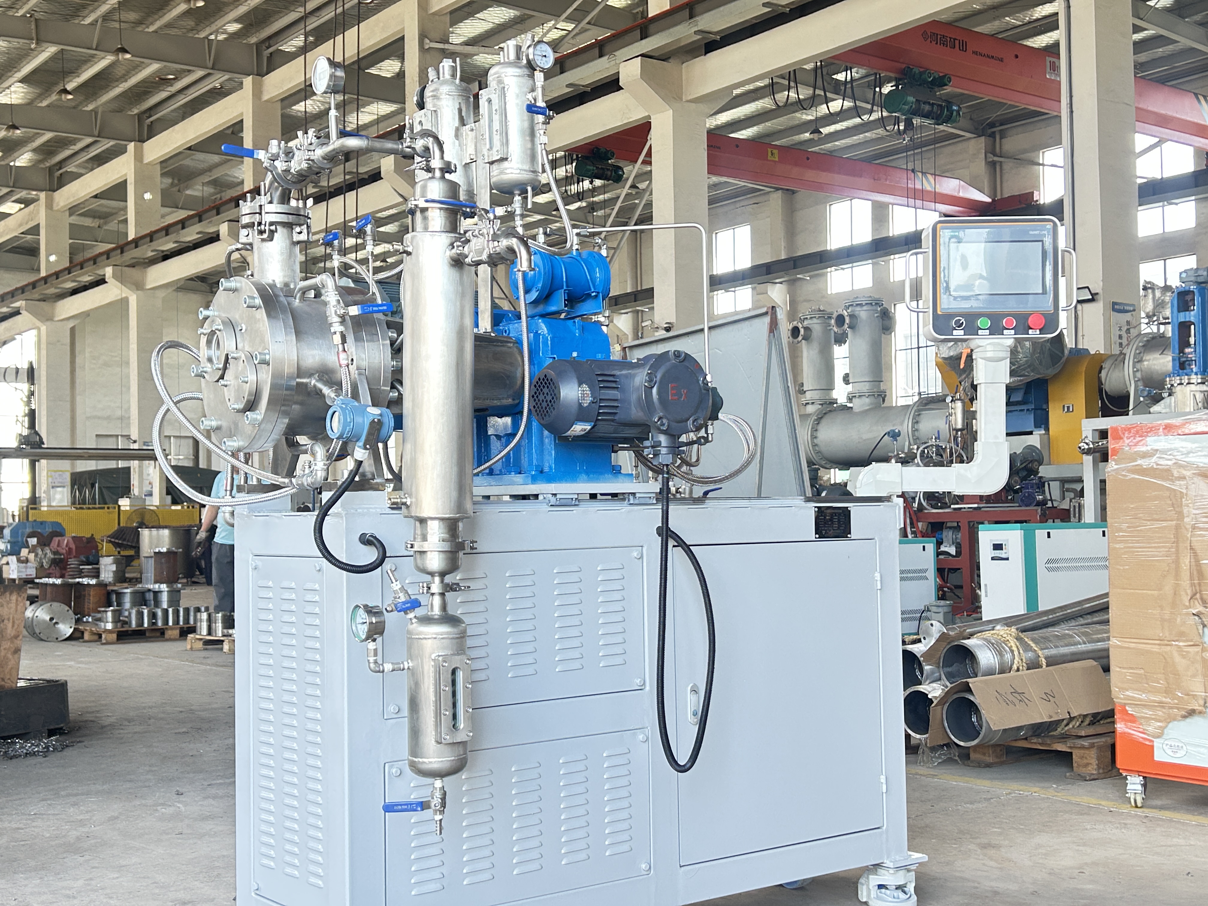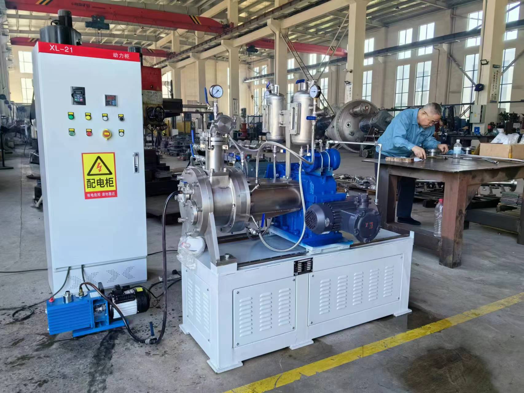 为了适应在真空状态下的操作,专门安装了适用于高粘度物料的齿轮泵式出料器。该出料器直接安装在主设备上,消除了设备内的死角。齿轮泵式出料器在稍微超负荷的条件下工作,以保证物料能连续地排出,并输入下一工段进行包装。