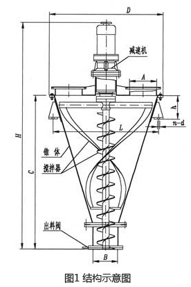该机主要由减速机、锥体、搅拌器、出料阀等组成,如图1所示。