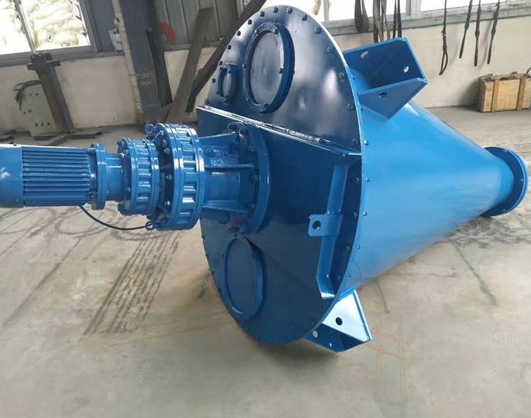 该机由摆线减速机直接驱动搅拌轴旋转。搅拌轴由两根与锥体吻合的螺带及实心螺旋组成,旋转时,螺带将物料由下向上沿混合机锥体内壁盘旋提升。同时又由于螺带呈锥状,运转时带面上的各点线速度不同,物料在其作用下产生了不规则的对流、剪切、掺混、扩散等,形成全方位的三维运动。搅拌轴的中心是一实心面体螺旋,在运转时将靠中心的物料提升,抛出。被抛出的物料一部分进入螺带,而被螺带抛出的物料又被吸收到实心面体螺旋的包络体内而提升。如此不断反复,使物料在极短时间内达到均匀混合。