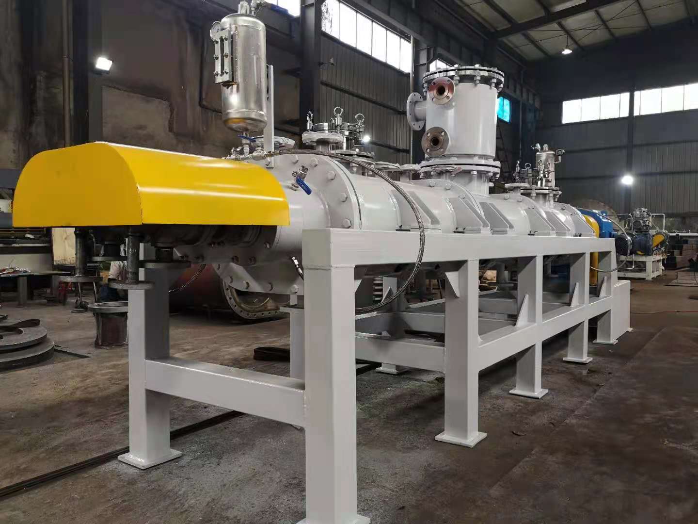 为了尽量增大单位设备容积的传热面积,WZS型自清洁脱挥器的壳体、搅拌轴和搅拌桨都通有导热介质。强力的混合和捏合作用能有效地使物料更快地表面更新,该作用与具有自清洁功能的传热面相结合,从而确保热、质传递所需的高表面更新速率。
