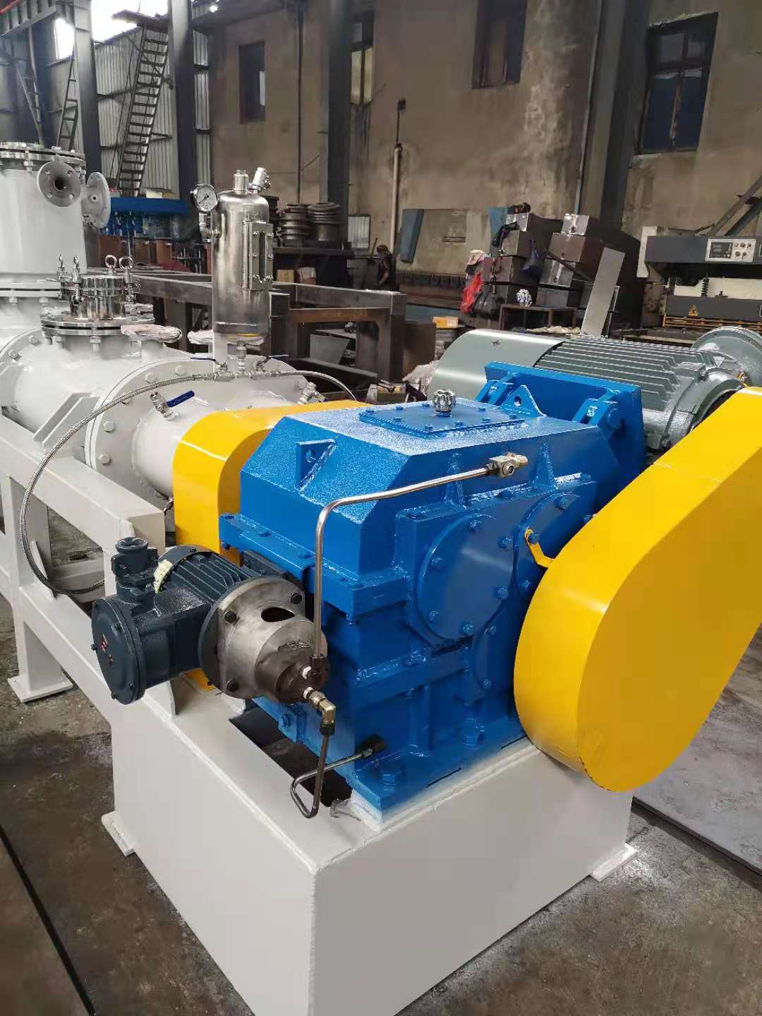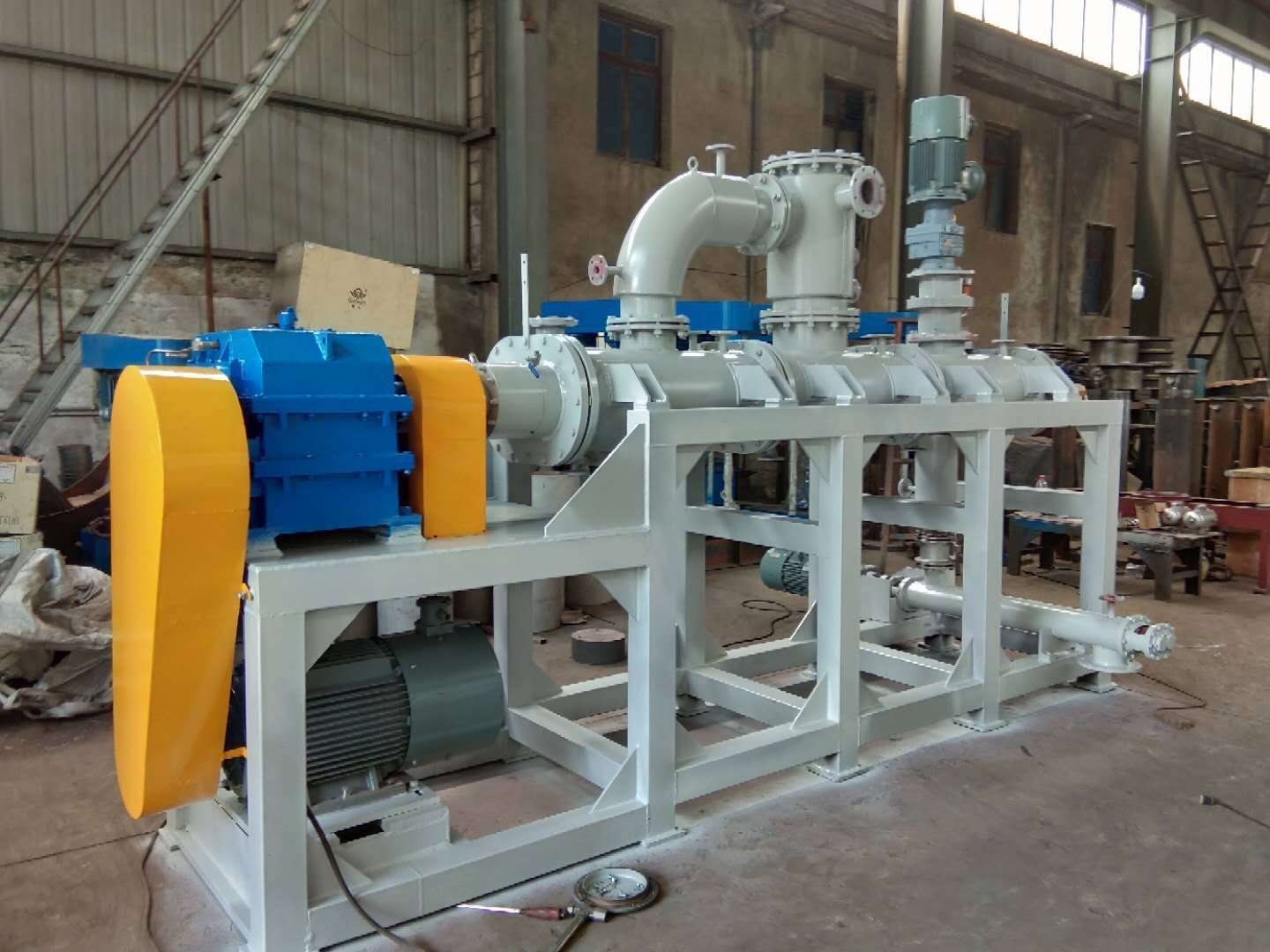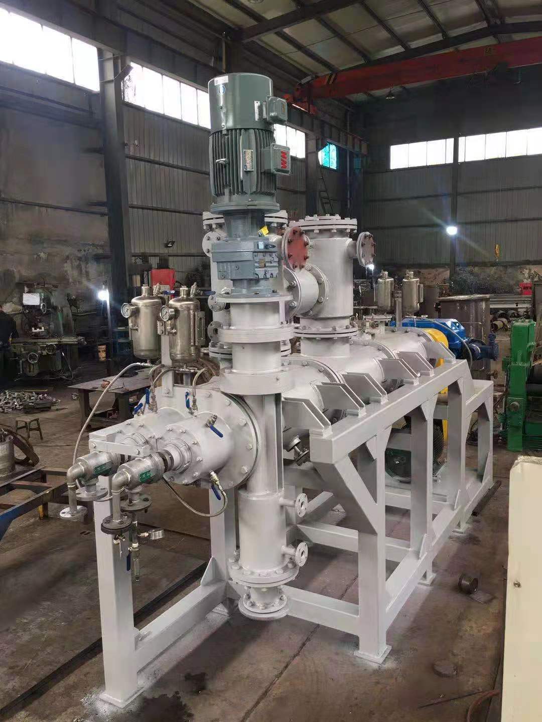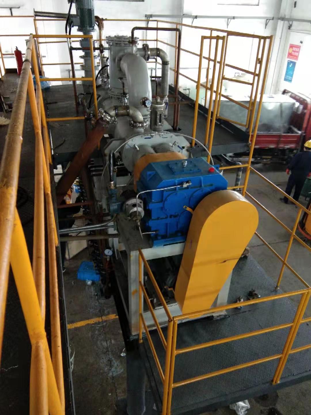 为了适应在真空状态下的操作,专门安装了适用于高粘度物料的齿轮泵式出料器。该出料器直接安装在主设备上,消除了设备内的死角。齿轮泵式出料器在稍微超负荷的条件下工作,以保证物料能连续地排出,并输入下一工段进行包装。