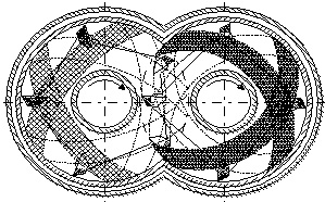 WZS型自清洁脱挥器为连续式操作,其由一个水平壳体和两个水平轴组成。在8字形截面的壳体内,两搅拌轴相互啮合,双轴同向旋转,同步转速比为 xx:xx,分别为xx rpm(主轴)和xx rpm(清洁轴)两个转速(见图1)。双轴旋转过程中所产生的动态轮廓线确保了设备中无死角,即自清洁作用(见图2)。为了在提供强力混合的同时又推动物料(包括高粘度物料)逐渐前移,搅拌桨和U形捏合杆按螺旋状排列,这种排列方式为高粘度的物料的轴向前移提供了推动力,而且能阻止物料的反向流动,使物料在设备中的流动接近平推流,从而提高了物料的脱挥效果。