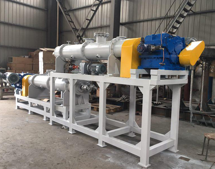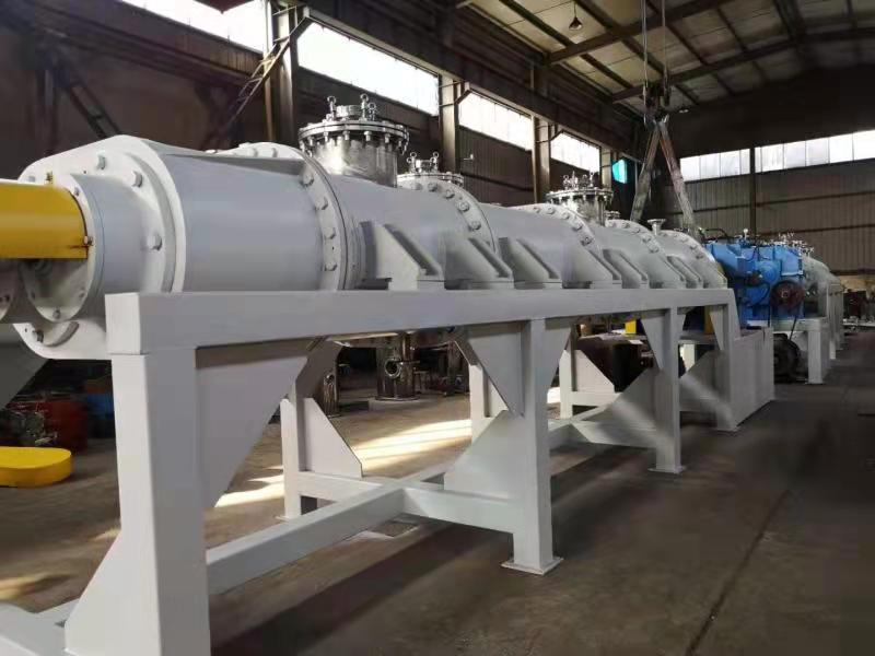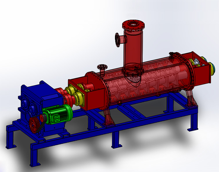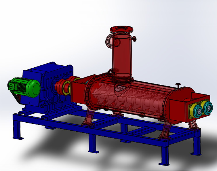 为了尽量增大单位设备容积的传热面积,WZS型自清洁脱挥器的壳体、搅拌轴和搅拌桨都通有导热介质。强力的混合和捏合作用能有效地使物料更快地表面更新,该作用与具有自清洁功能的传热面相结合,从而确保热、质传递所需的高表面更新速率。