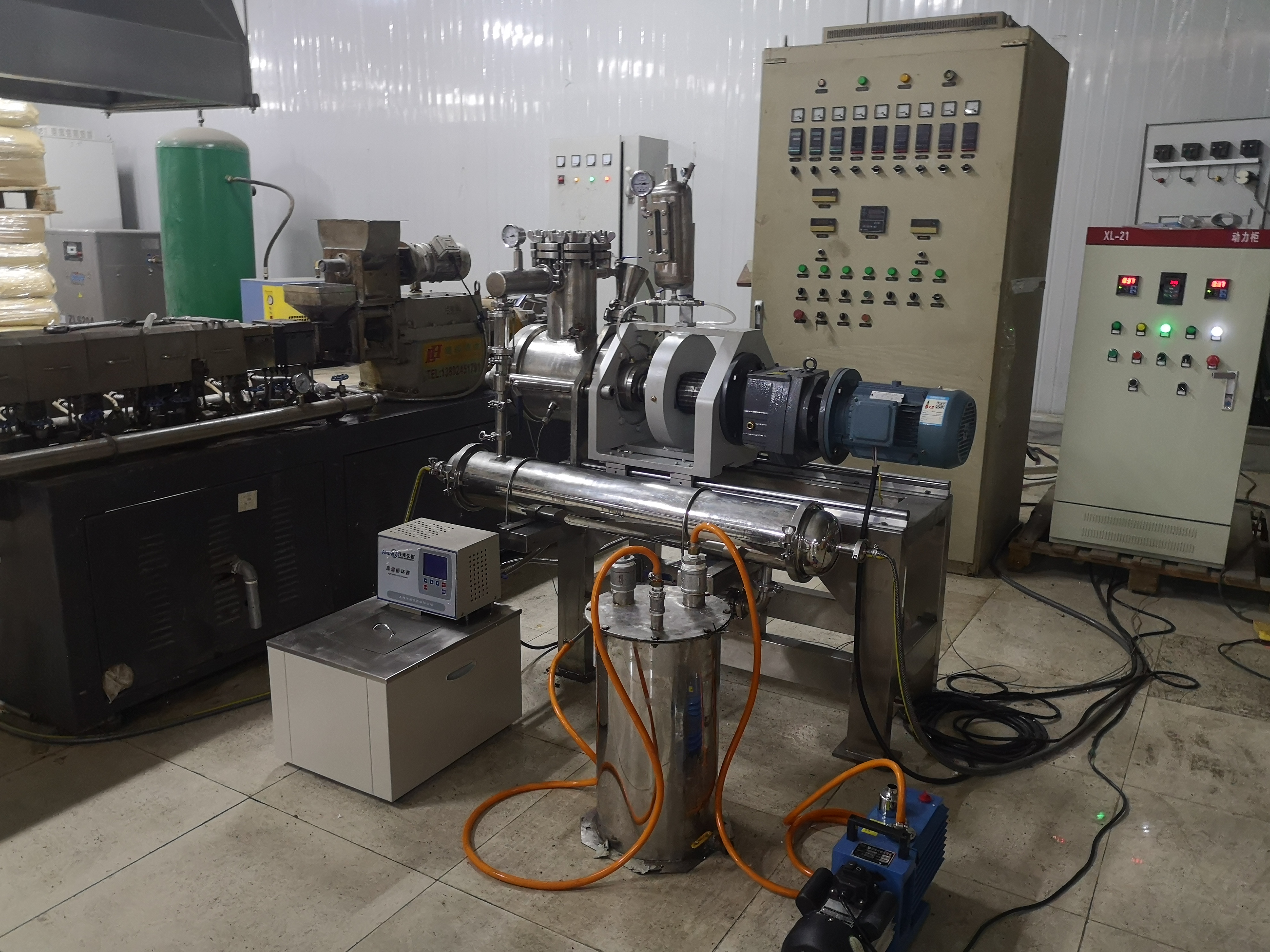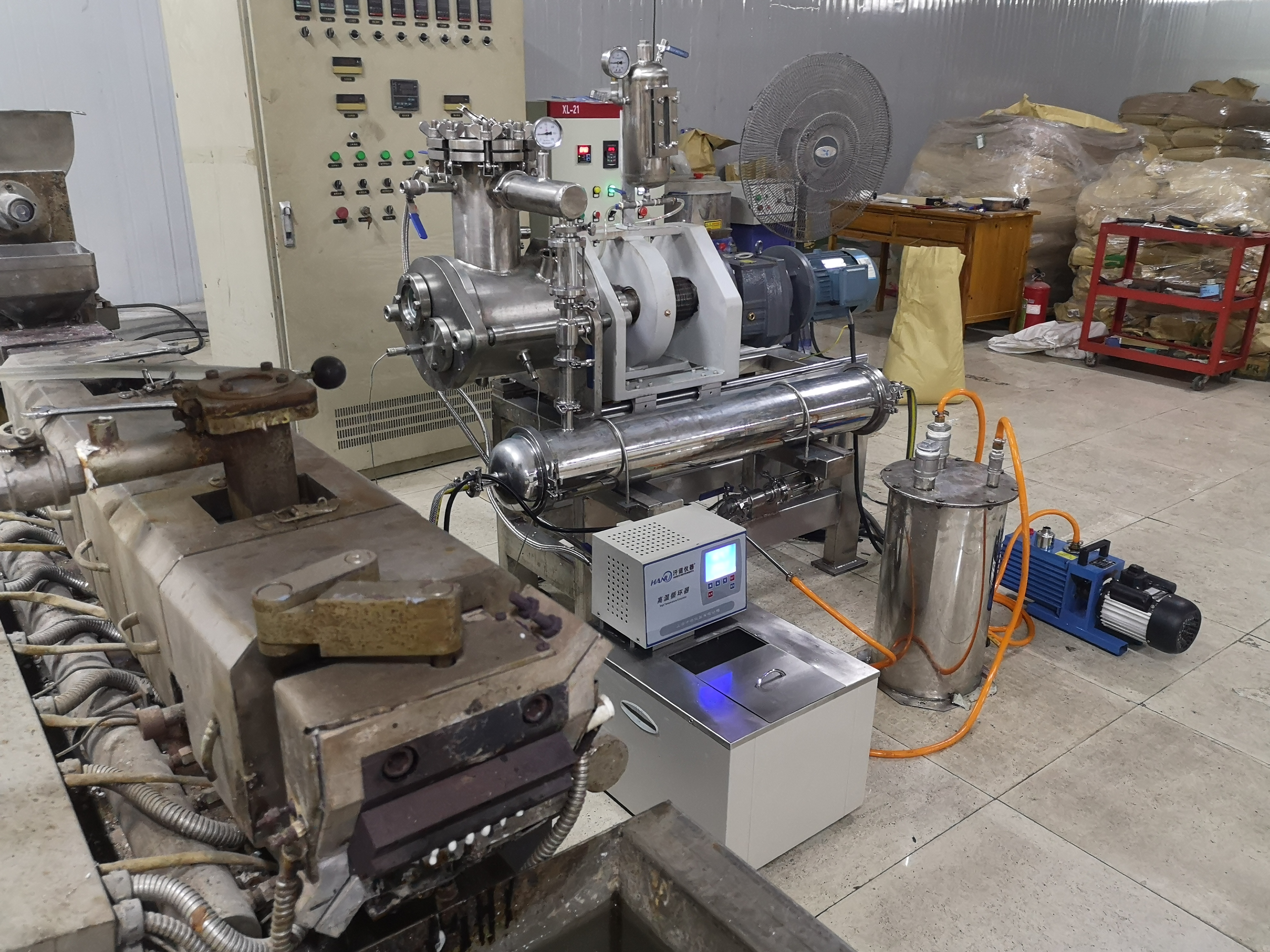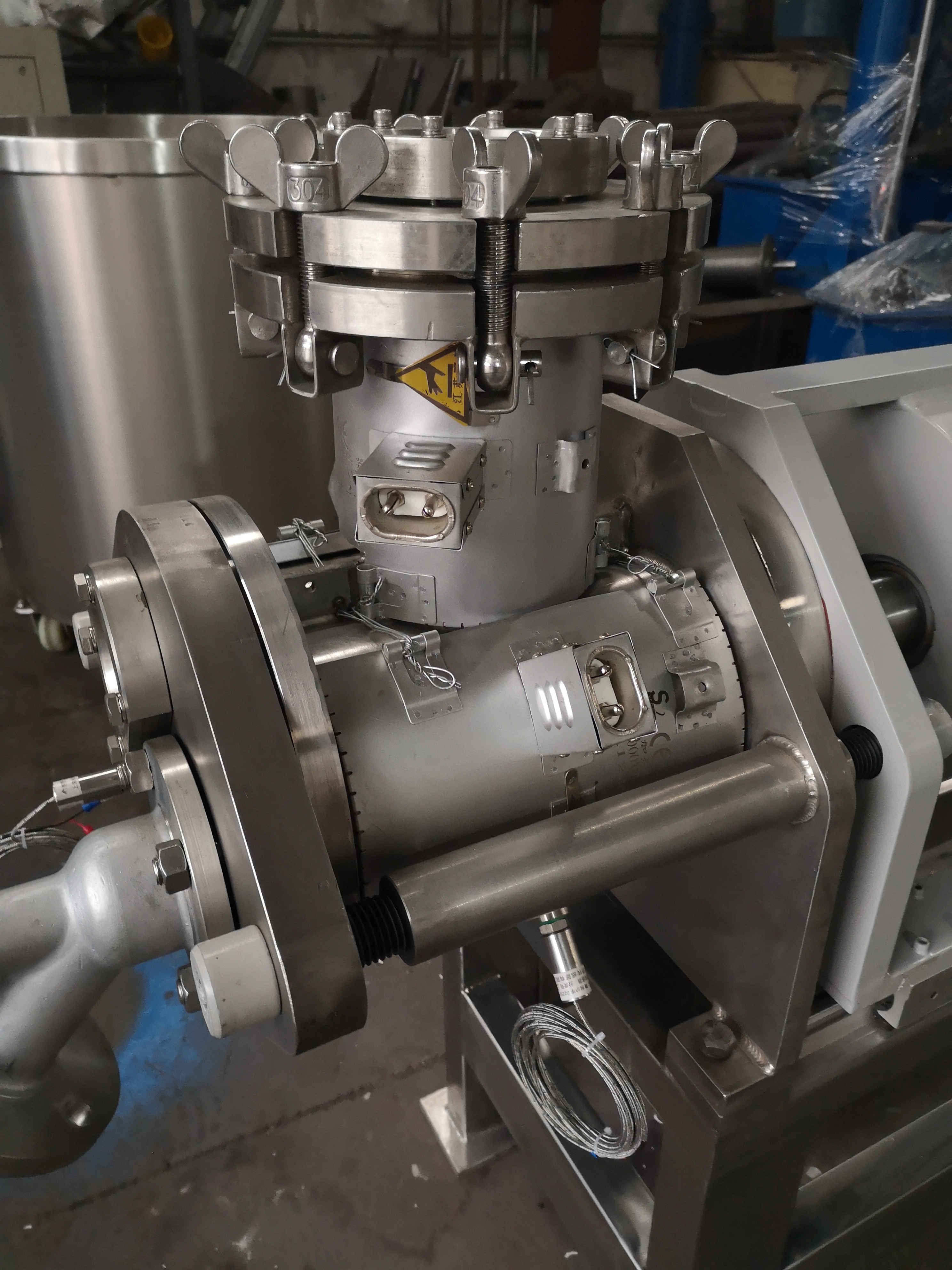为了适应在真空状态下的操作,专门安装了适用于高粘度物料的齿轮泵式出料器。该出料器直接安装在主设备上,消除了设备内的死角。齿轮泵式出料器在稍微超负荷的条件下工作,以保证物料能连续地排出,并输入下一工段进行包装。