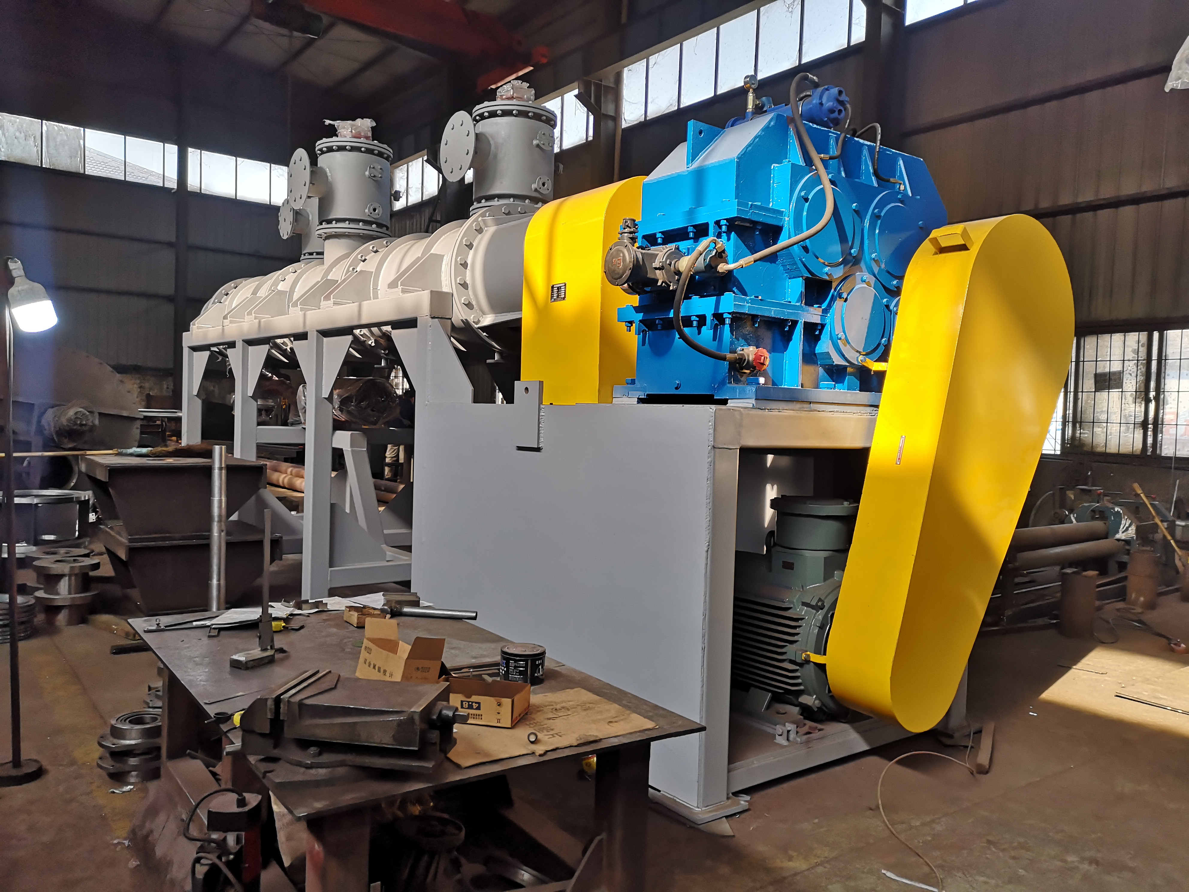 为了适应在真空状态下的操作,专门安装了适用于高粘度物料的齿轮泵式出料器。该出料器直接安装在主设备上,消除了设备内的死角。齿轮泵式出料器在稍微超负荷的条件下工作,以保证物料能连续地排出,并输入下一工段进行包装。