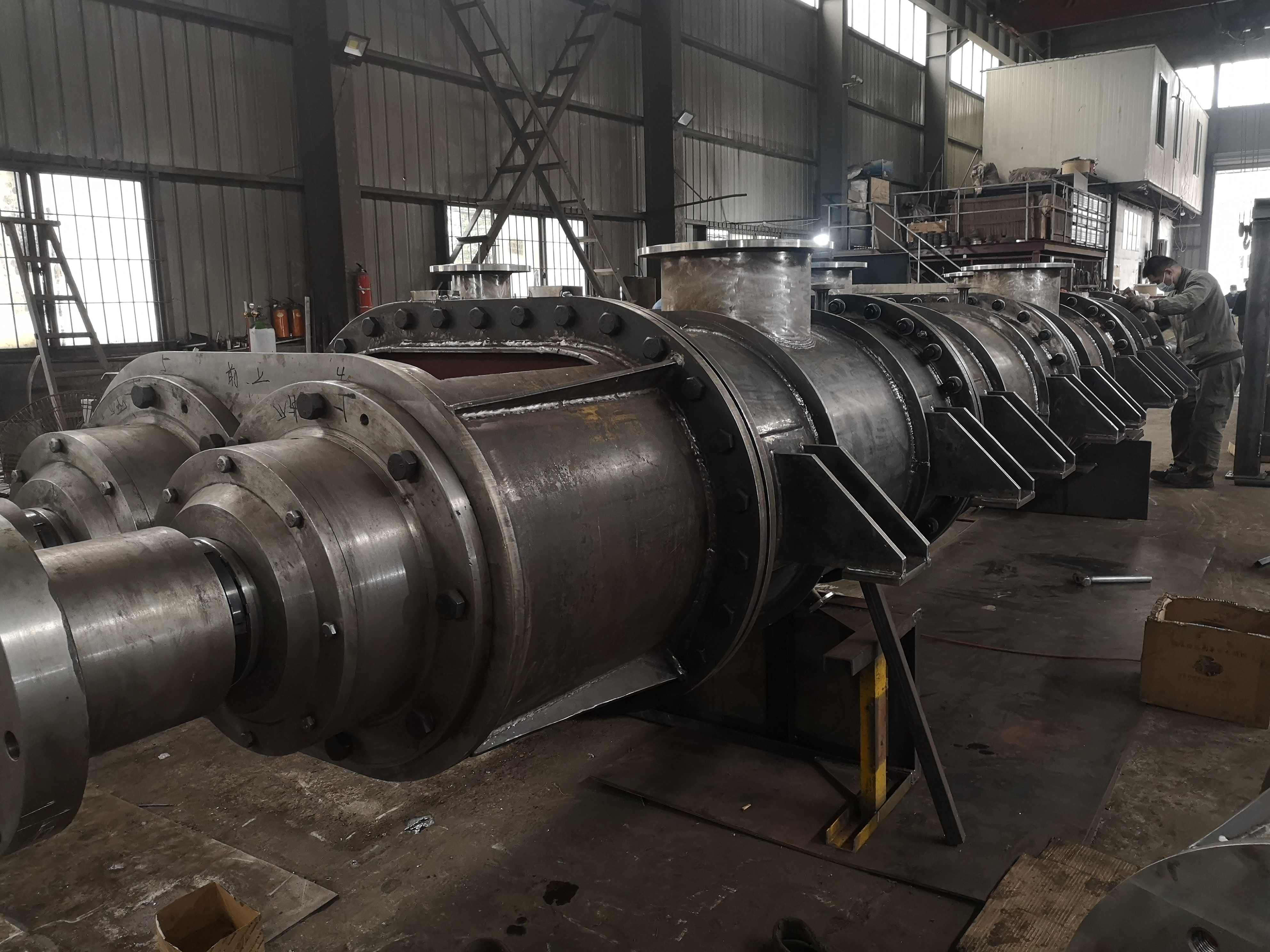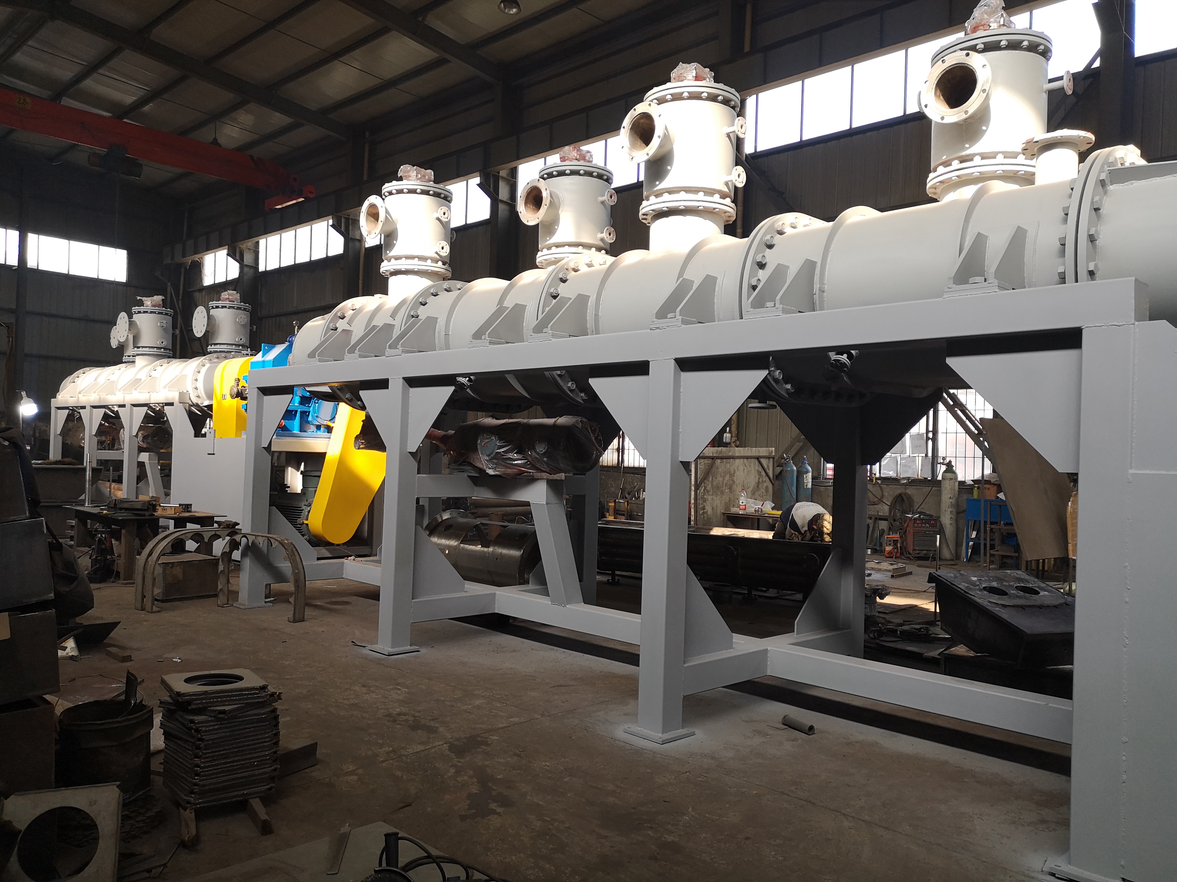 为了尽量增大单位设备容积的传热面积,WZS型自清洁脱挥器的壳体、搅拌轴和搅拌桨都通有导热介质。强力的混合和捏合作用能有效地使物料更快地表面更新,该作用与具有自清洁功能的传热面相结合,从而确保热、质传递所需的高表面更新速率。