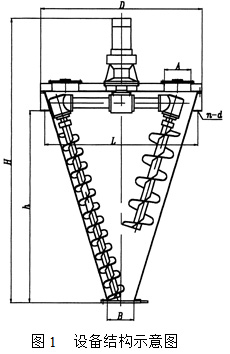 DSH型混合机结构如图1。主要由锥体、带电机减速机、传动机构、螺旋及出料阀等部件组成。在锥体内安装两根螺旋,螺旋采用非对称结构。长螺旋沿锥壁安装,短螺旋靠近锥体中心部位安装,且螺旋直径比长螺旋大。使用时,两螺旋作自转的同时又沿锥壁作公转,即行星运动。该机使用特特征: