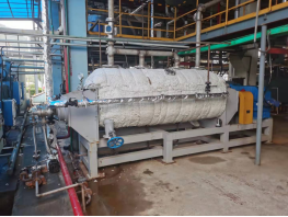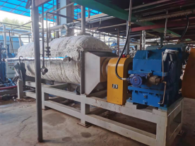 方案1:利用索孚专利产品卧式单自清洁薄膜蒸发器和卧式双轴自清洁干燥机在高温330C°以下和真空-0.095MPa左右条件下,回收大部分有用高沸物溶剂产品,最终残留量≤0.2%,再将釜残废盐等直接干燥固化破碎处理;(物料特性:溶剂脱除完毕直接固相析出和通过高温催化裂解成固相物料,例如:废盐釜残,苯二酚釜残,甲基丙烯酸釜残,二甲基-咪唑啉酮釜残,亚硫酸氢钾盐干燥,二甲基亚砜(DMSO)釜残处理,染料中间体废活性炭干燥处理,污泥等等)